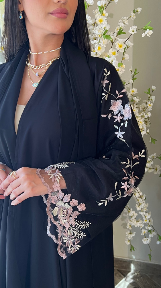 عباية سوداء كريب مايتعرفط مزينه بأكمام تل مبطنه ومطرزة بالخيوط الملونة