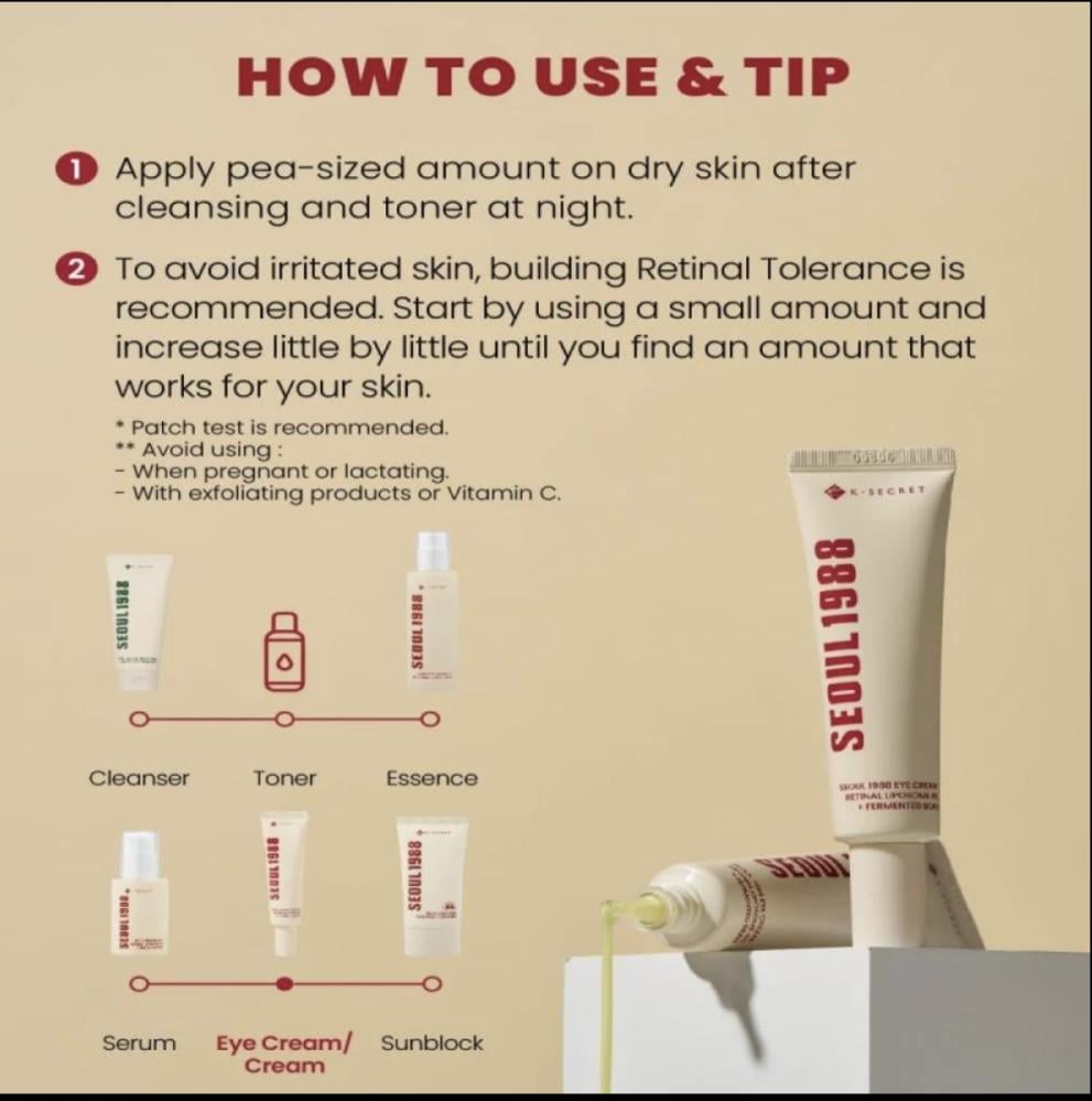 احصلي على عيون أكثر شبابًا ونضارة مع كريم العين سيول 1988 بالريتينال 30مل، تركيبة كورية فعالة تعمل على شد البشرة تحت العين، تفتيح الهالات السوداء، وترطيب عميقيدوم طويلاً. يحتوي على 4% ريتينال ليبوزوم، مستخلص الفاصوليا المخمرة، وحمض الهيالورونيك لتجديد الخلايا وتقليل الخطوط الدقيقة. مثالي للعناية اليومية بالبشرة الحساسة حول العينين.